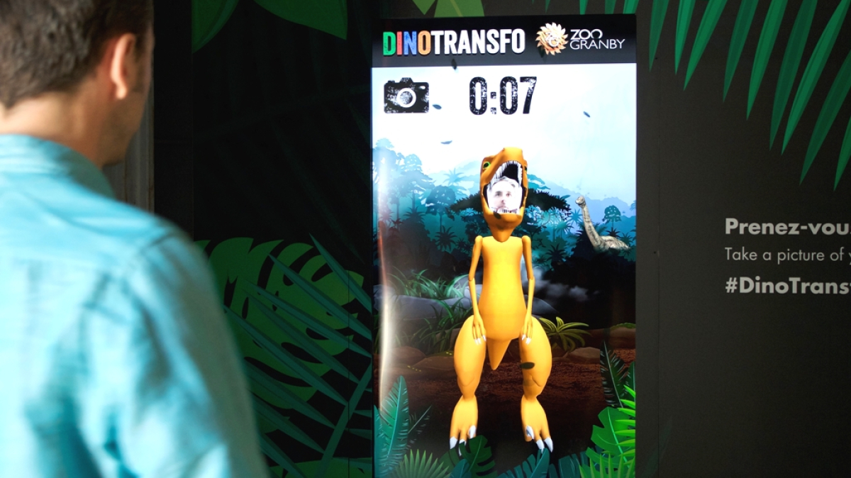 L'installation DinoTransfo est un miroir interactif qui métamorphose chaque joueur en dinosaure, le temps de prendre une photo. L'utilisateur prend place dans une cabine qui analyse sa personnalité. L'utilisateur est transformé! Le miroir le représente alors sous les traits du dinosaure 3D qui correspond à sa personnalité. De la vision numérique capture le mouvement du participant afin d'animer le dinosaure en direct. L'effet est saisissant.