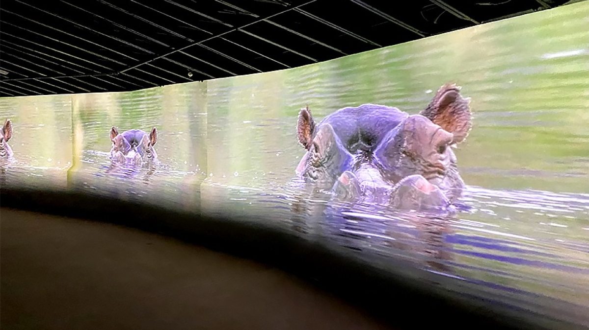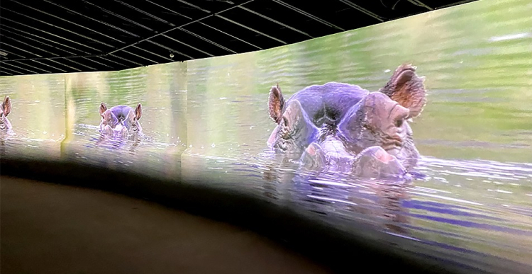 L’expérience visuelle et sonore immersive conçue et réalisée par Simon Carpentier, artiste reconnu mondialement entre autres pour ses collaborations avec le Cirque du Soleil à titre de compositeur musical, enveloppe les visiteurs dans une ambiance à couper le souffle. L'expérience d’une durée de 17 minutes explore l’hippopotame, son habitat, les espèces animales qu’il côtoie et la présence de l’hippopotame dans la culture populaire. La trame sonore composée par Simon est inspiré des sons distinctifs produits par l’animal pour communiquer, sous l’eau comme au-dessus. La vidéo est diffusée par 5 projecteurs sur une surface de 52 pieds de largeur, sur les murs du couloir qui fait face au bassin des hippopotames.