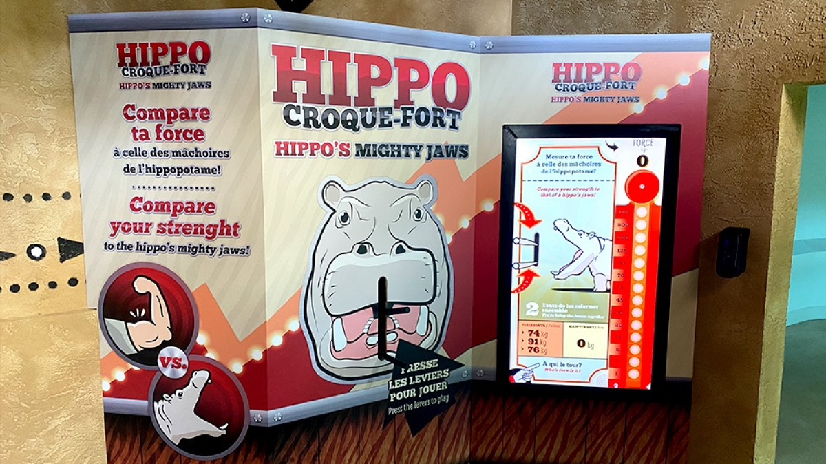 Les visiteurs sont invités à comparer leur propre force physique à celle de la mâchoire de l’hippopotame via des leviers mécaniques robustes. Des capteurs mesurant la force appliquée sur les leviers transmettent l’information à un microcontrôleur. Une jauge de puissance qui rappelle le jeu de fête foraine de la martoche indique le score du joueur à l'écran. Une conclusion personnalisée compare la force de chaque joueur à celle d'autres animaux bien connus.