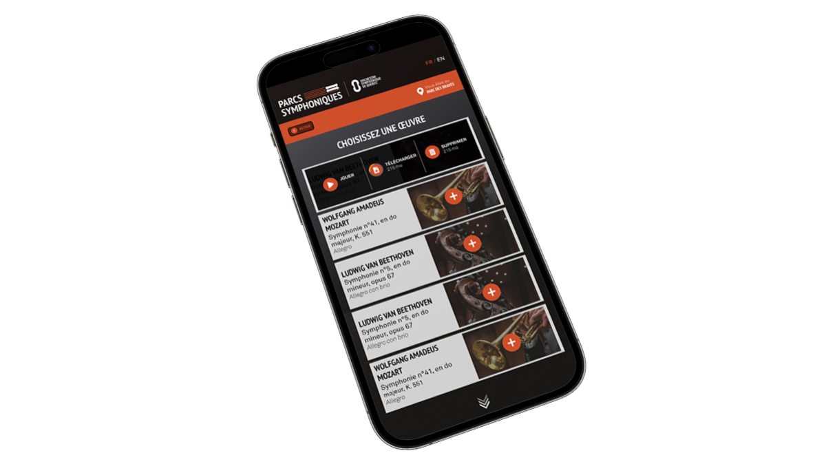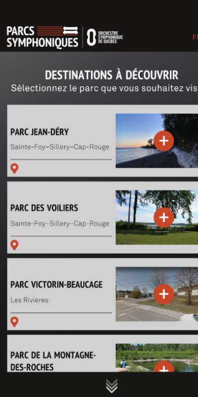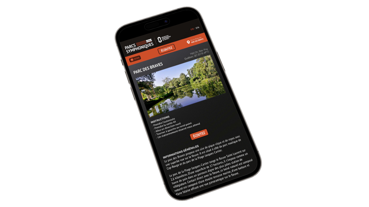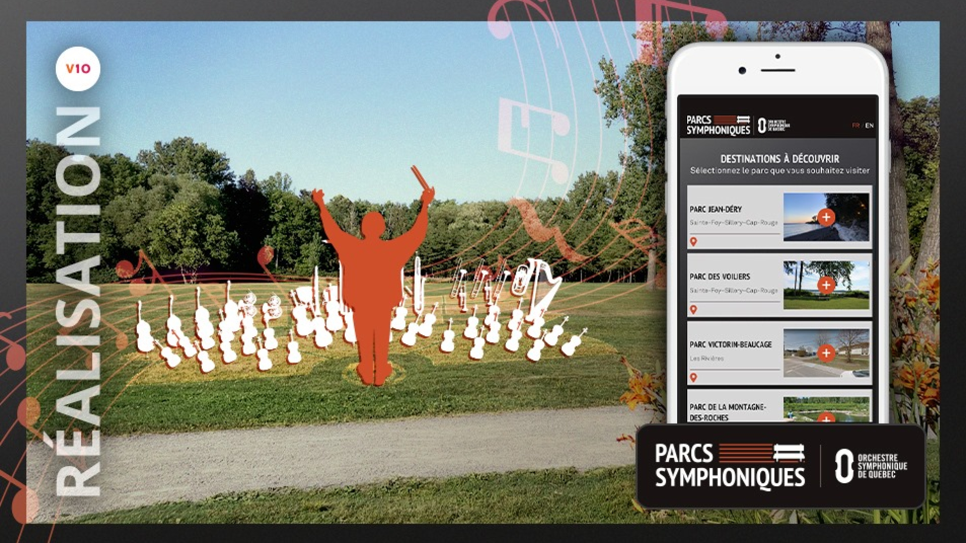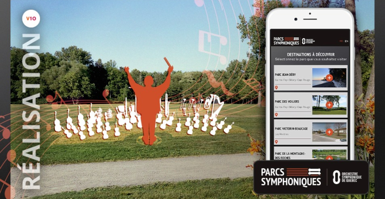 L’Orchestre symphonique de Québec souhaitait offrir une expérience d’écoute interactive dans différents parcs de la ville de Québec. En utilisant le GPS de votre appareil intelligent, l’application « Parcs symphoniques » vous invite à vous déplacer physiquement dans le parc sélectionné pour écouter les différents instruments de l’orchestre comme si vous étiez sur scène. Munissez-vous de vos écouteurs et plongez au cœur d'œuvres musicales interprétées par l’Orchestre symphonique de Québec telles que Carmen (George Bizet) ou Guillaume Tell (Gioachino Rossini), dans une multitude de parcs : Domaine Maizerets, Parc Jean-Dery, Victorin-Beaucage, parc de la Montagne-des-roches, etc. L'application est disponible gratuitement sur iOS et Android. Grâce à l’application Parcs symphoniques, partez à la rencontre des instruments, des œuvres et de leur compositeur, tout en profitant du grand air!